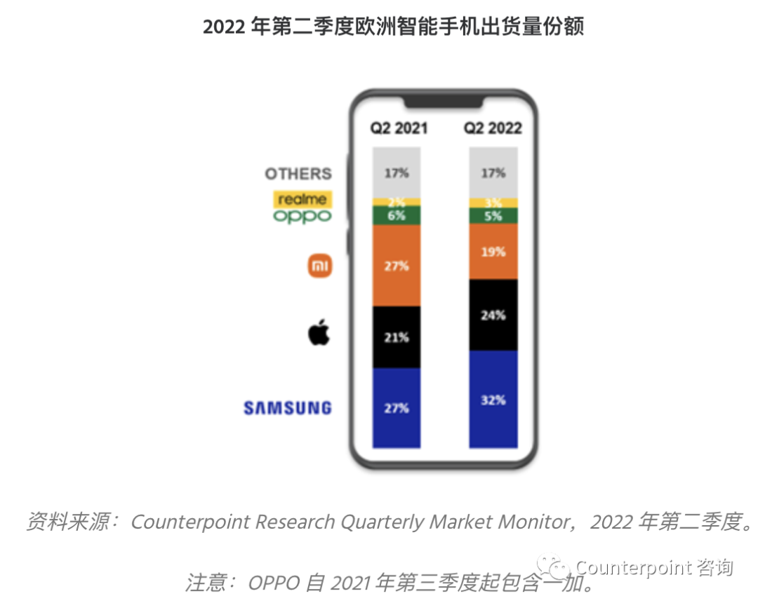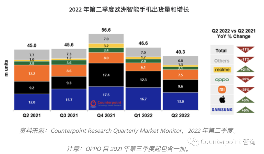 依据Counterpoint最近发布的陈述,因为微观环境恶化和地缘政治的不确定性,2022 年第二季度欧洲智能手机出货量同比下降 11% 至 4000 万部。