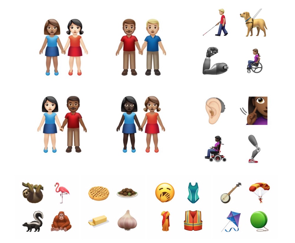 ,这一共 59 种表情将于本年秋天登陆 iPhone、iPad、Mac 和 Apple Watch,考虑到可选性别的变体,这些表情共有 75 款。这一波新 emoji 包括残障人士主题,比方导盲犬、机械手臂、助听器等,苹果称这能表现其价值观和包容性。此外还有树懒、红鹳、臭鼬、猩猩、华夫饼、黄油、洋葱、打哈欠表情、连体泳衣、风筝、悠悠球等 emoji。